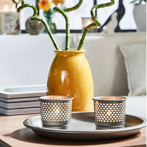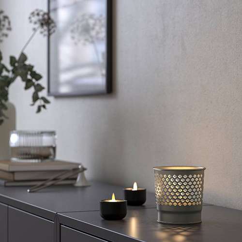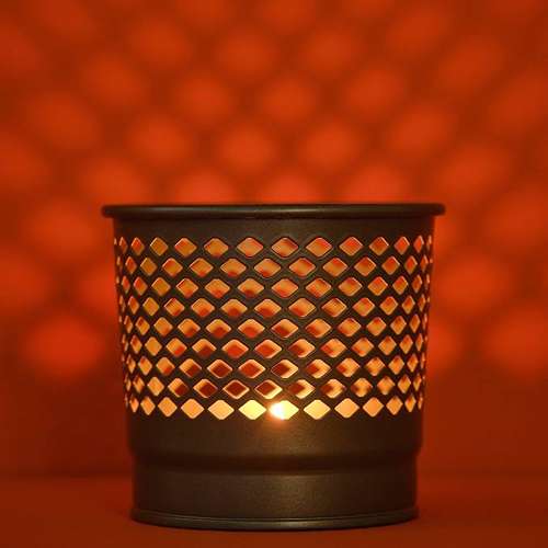 نور شمع از میان فلز بریده شده می تابد و الگوهای تزئینی و فضایی دنج ایجاد می کند.