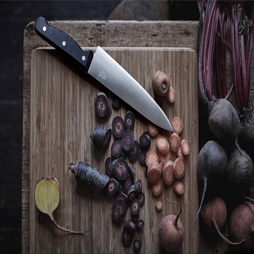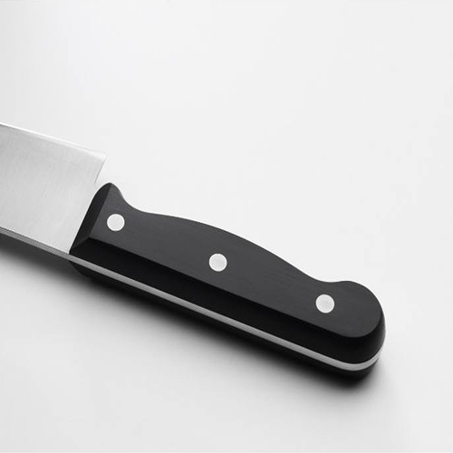 تیغه محکم، تقسیم و خرد کردن، مثلاً گوشت و سبزیجات ریشهای را آسانتر میکند. ساخته شده از فولاد ضد زنگ مولیبدن/وانادیوم، به همین دلیل چاقو برای مدت زمان بسیار طولانی تیز میماند. دندانه چاقو در طول دسته امتداد دارد و آن را بسیار مقاوم در برابر سایش و متعادل میکند.جنس این چاقو از استیل و دسته آن مقاوم می باشد