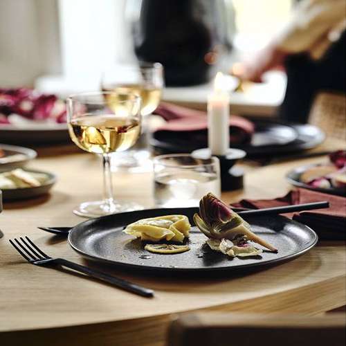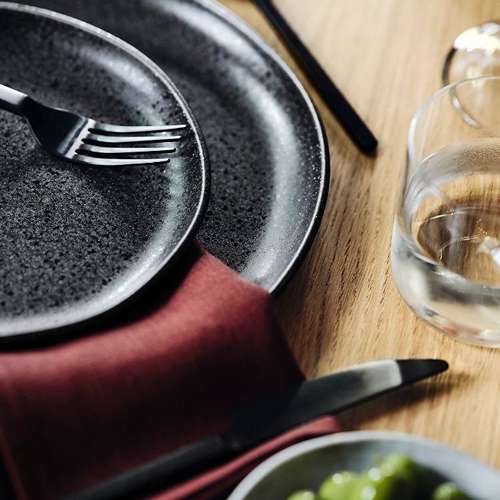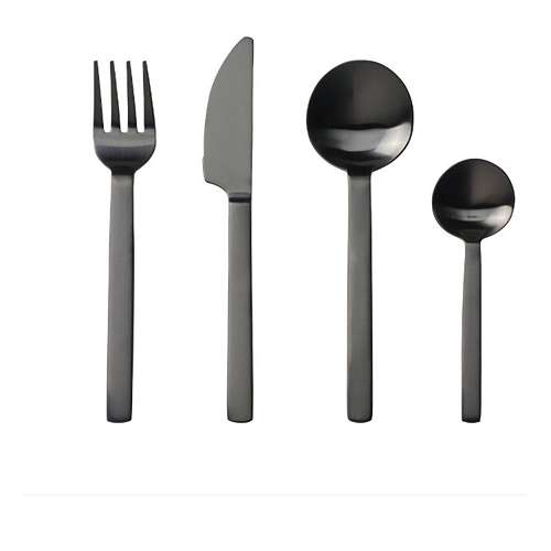 این سری با طراحی شخصی، کیفیتی ماندگار و عشق به جزئیات، هر وعده غذایی را خاص میکند. این قطعات کارد و چنگال دارای طراحی مینیمالیستی و زیبایی هستند که با بقیه سریها مطابقت دارد. این کارد و چنگال مینیمالیستی با خطوط مدرن و مستقیم، جلوهای زیبا به چیدمان میز شما میبخشد. فولاد ضد زنگ به رنگ مشکی، به کارد و چنگال جلوهای پیچیده و مینیمالیستی میبخشد. این پک شامل شامل: چنگال، چاقو، قاشق و قاشق چایخوری، از هر کدام ۶ عدد. قبل از اولین استفاده، این محصول را بشویید.